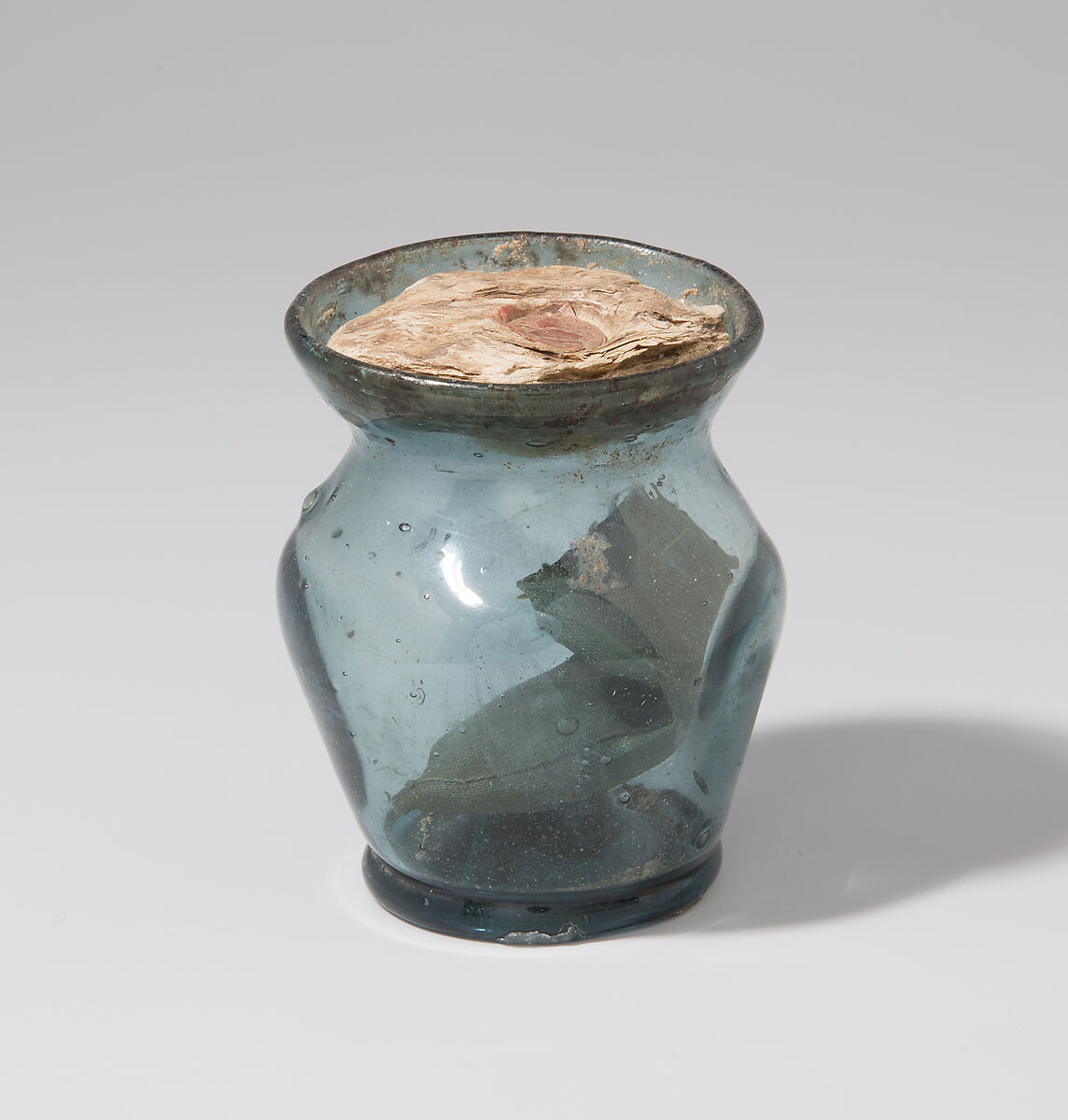 - Medium: Free-blown glass with applied decoration, boiled leather, silk, wax, and possible human remains