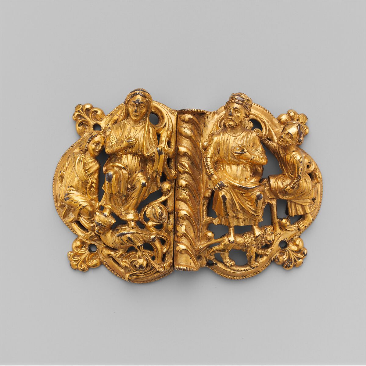The monumental classicizing figure style and the soft tubular drapery typify the transitional style of about 1200. The masterful rendering of this object has led scholars to associate it with the work of Nicholas of Verdun, an outstanding goldsmith of the period. The figures are generally thought to represent Solomon and the queen of Sheba, but they also have been interpreted as Ahasuerus and Esther. A similar clasp was excavated at Dune in Gotland; although the style is different, parallels in iconography suggest a common traditional source. The clasp probably was intended as a girdle or cloak closure.