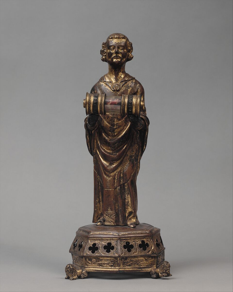 - Medium: Copper gilt; reliquary vessel: silver, champleve enamel, glass, textile wrapped relic