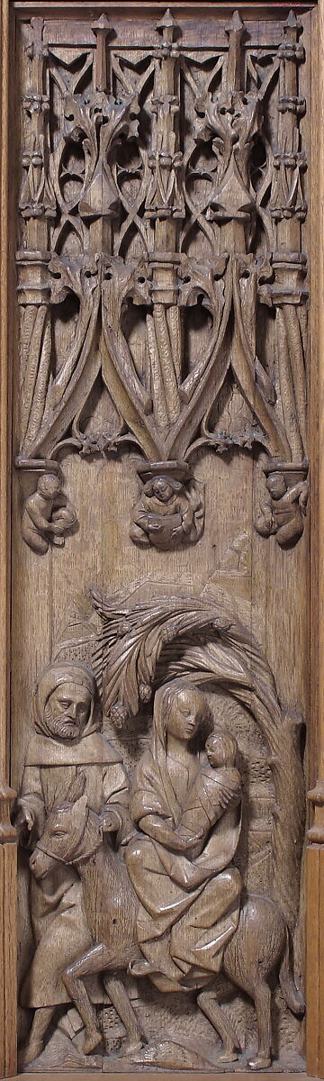 Carved on The Cloisters' thirty-five oak panels (50.147.1–38) are scenes from the lives of the Virgin and Christ, each set under an elaborate canopy of single or double arches. The exuberant latticework surrounding the arches provides an almost encyclopedic display of pinnacles, crockets, spirals and other fanciful decorations. As in many late medieval works, the figures are foreshortened within their inhabited surroundings, adding depth and drama to the composition.