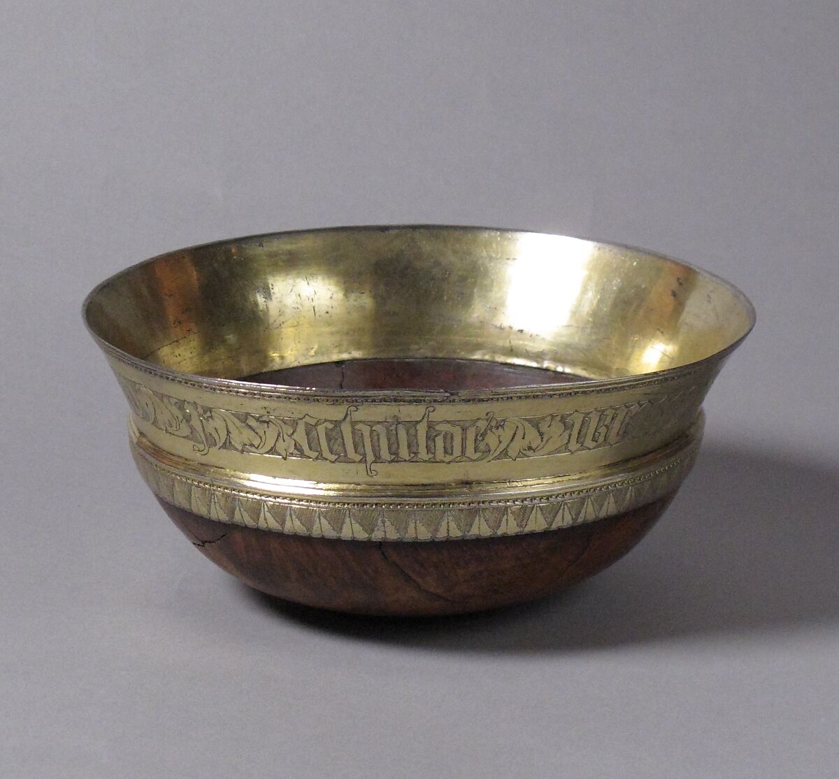 The term "mazer" derives from a German word meaning "burled" or "grained" and is generally applied to any lathe-turned root or hardwood object. The inscription on the lip of this drinking bowl reads: "Reason bade that I should write, think much, and speak little."