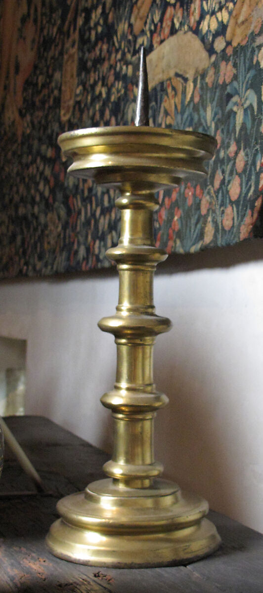 Medieval man took advantage of the light of day as much as possible, but, in the early dark of winter, he had to have recourse to other forms of light, most frequently that of the fireplace. In the fourteenth and fifteenth centuries, the smoky torches of resinous wood, which formerly had been used to provide additional light in the rooms of castles, were generally restricted to use at outdoor events. Candles mounted in wall brackets, chandeliers, or candlesticks, and in some cases, oil lamps, were used to light interiors. Common candles made of tallow had wicks that needed constant trimming and burned with an unpleasant smell. The better quality candles, made of beeswax and used with pricket candlesticks, were so expensive that only the wealthy could afford them. Although in the late Middle Ages large pricket candlesticks were more commonly found in the church, were are some representations of them in use of the dinner table or for other domestic purposes.