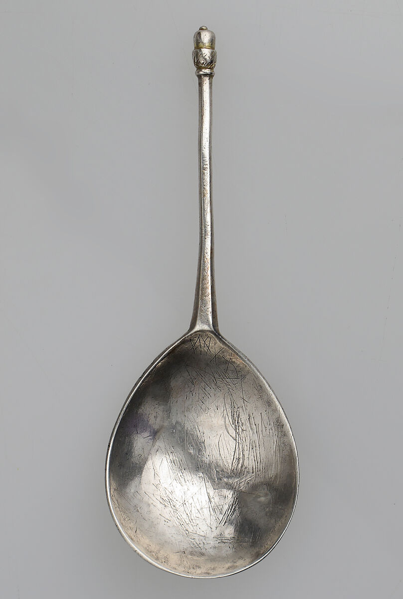 The first known mention of the acorn knop appears in a will of 1348, in which one John de Holegh bequeathed to Thomas Taillour "12 silver spoons with akernes." Later references to such acorn-knop spoons indicate that the finials were gilded as were those of other types of silver spoons of this period.
