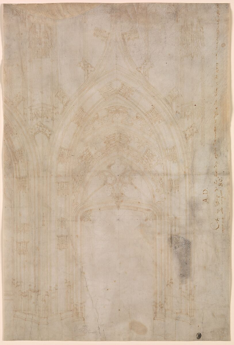 Perfectly proportioned, finely detailed, and executed with ease, everything about this drawing suggests a confident and experienced draftsman intimately familiar with the architectural vocabulary and design methods of the most sophisticated urban workshops of late fifteenth-century northern France. Though there is no evidence that the drawing served as a model for any existing building, it is similar to the west facade of the parish church of Saint-Maclou in Rouen designed in the 1430s and built in the 1480s.