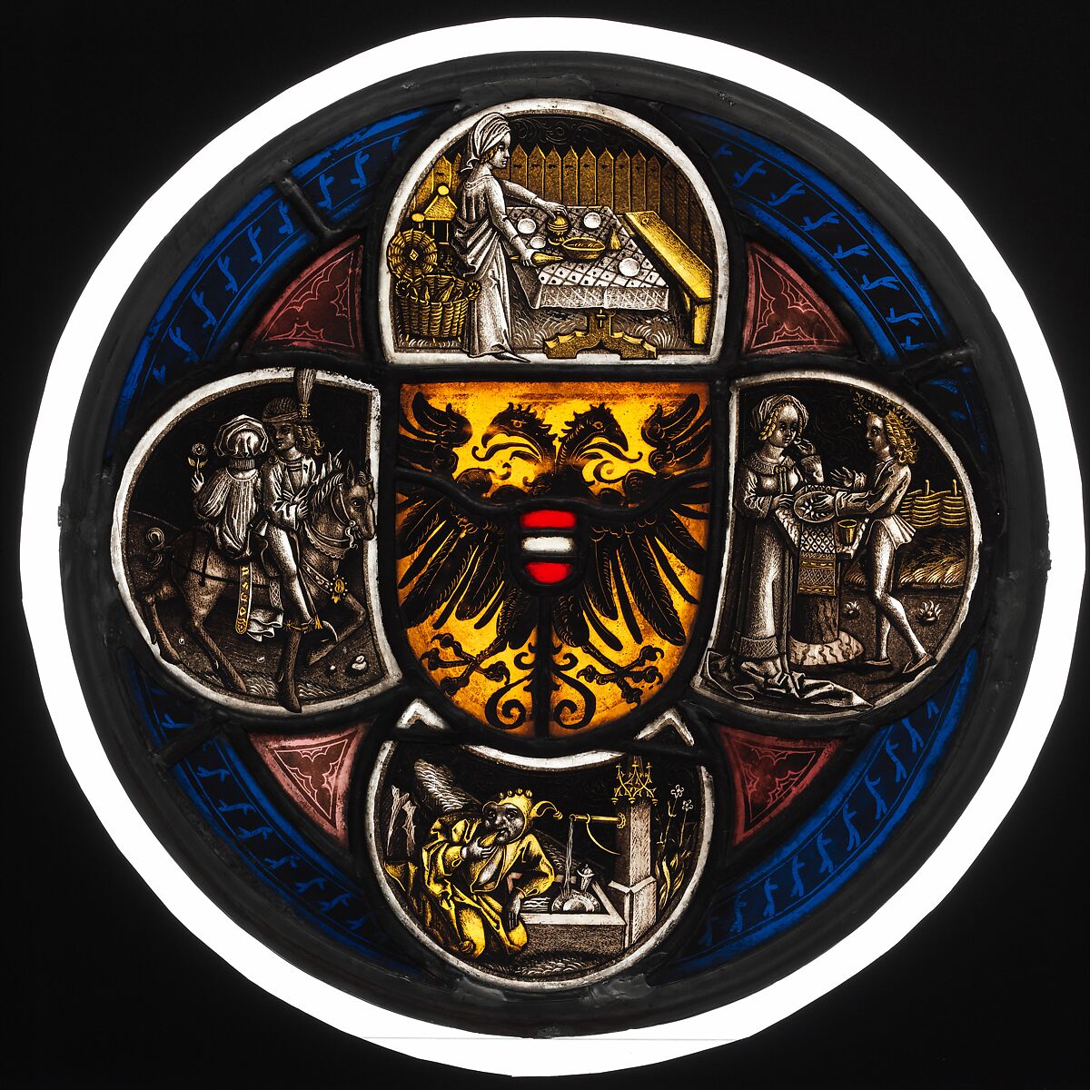 In the center of this panel are the imperial arms of Austria. The scenes in the quatrefoil represent a variety of secular vignettes. These scenes may signify a tournament masquerade of the type held in Nuremberg before Lent, which would explain the presence of fools, feasts, and lovers. Such imagery was understood as social satire in late medieval art. The number of similar quatrefoil panels that have survived suggests considerable popularity. The origin of the designs is uncertain, but many copies and variations were made in several Nuremberg, workshops, including that of Albrecht Dürer.
