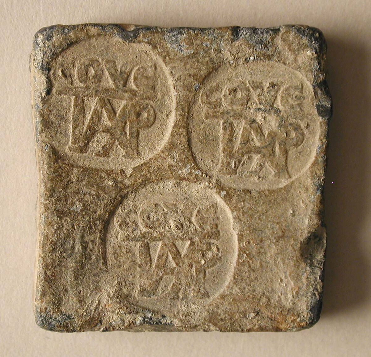 Stamped with a Greek monogram that most likely reads "eparch of the city," this three-ounce ingot is probably a commodity marker, indicating that the city's eparch has inspected and approved the material.