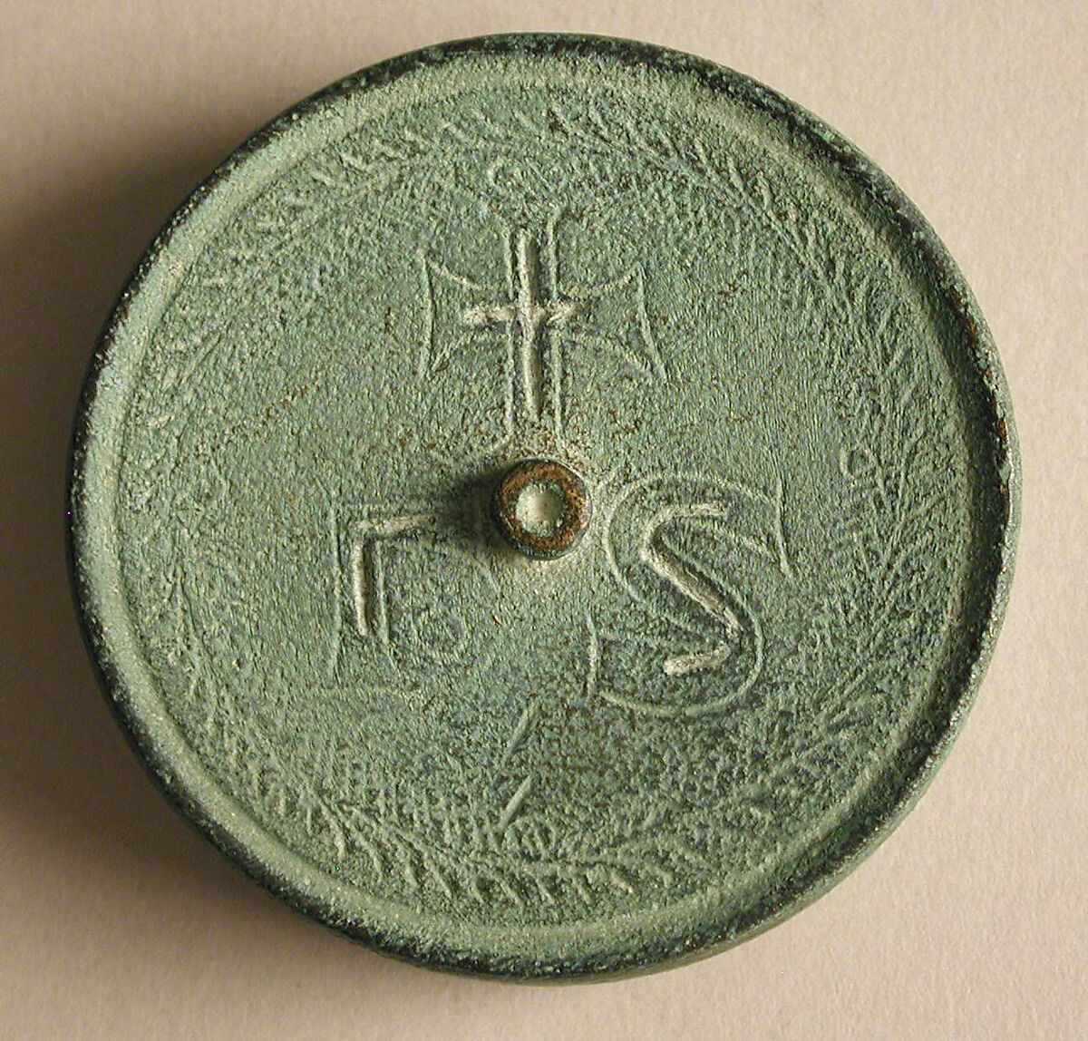 These objects are decorated with a cross and their respective weights in Greek initials-six ounces, two ounces, and one ounce-within a herringbone wreath. Most round weights were turned on a lathe, but the smallest of these three appears to have been cast in a mold instead.