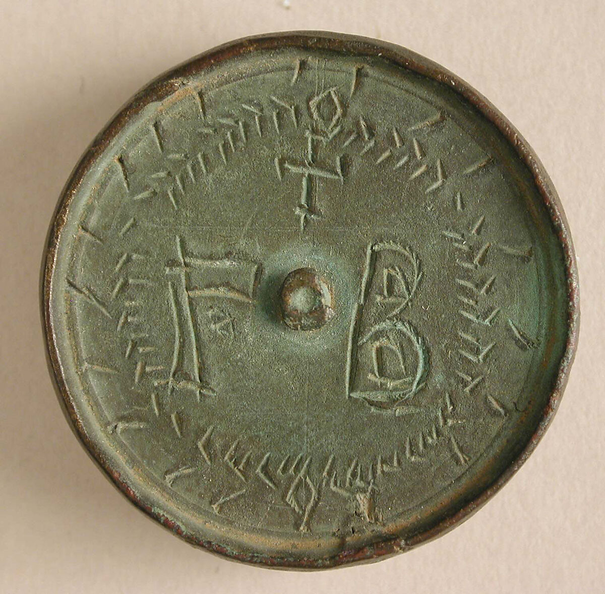 These objects are decorated with a cross and their respective weights in Greek initials-six ounces, two ounces, and one ounce-within a herringbone wreath. Most round weights were turned on a lathe, but the smallest of these three appears to have been cast in a mold instead.