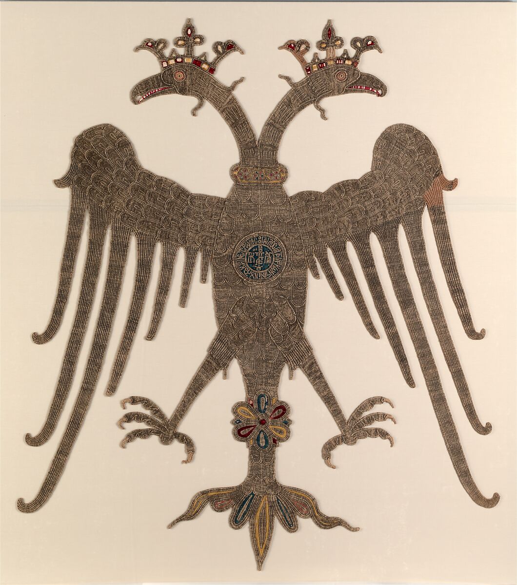 The double-headed eagle became the primary symbol of the state during the late Byzantine centuries and was also adopted for liturgical use. This huge eagle was probably used as an altar cloth or as a podea, a skirt hung beneath an icon. The inscription, which connects the owner with distinguished imperial dynasties, exaggerated the claims of a pretender to the patriarchal throne.