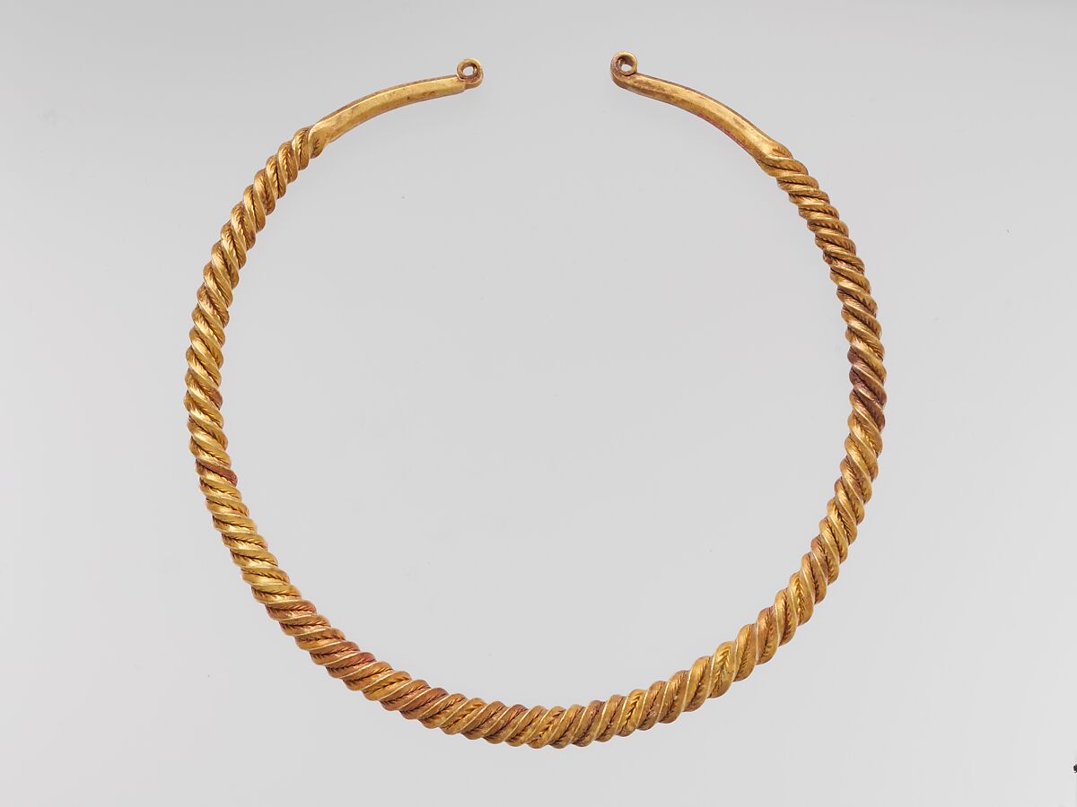 This elegant and technically accomplished solid gold torque, which weighs more than a pound, is a superb example of the mastery of goldsmiths in Iron Age Europe. Such an imposing object would have been an emblem of status and power. Its excellent condition suggests that it might have served as a ritual offering or been placed in a tomb to accompany the dead into the afterlife. It may also simply have been deluxe jewelry. In about 50 B.C. the Roman historian Diodorus Siculus wrote that Celts in Gaul “gather gold that is used for ornaments not only for women but men as well, for they wear bracelets on their arms and wrists and also massive solid-gold collars around their necks.” The torque may have been made from a cast gold blank that was deeply incised or channeled along its length on four sides, evenly notched along some of the edges, and then twisted. Or it may have been constructed of four graduated square lengths of gold that were evenly notched and then twisted. Such techniques employing single or multiple strands of gold were used in several cultures in the first millennium B.C., but they were most widespread among the Celts, who populated much of western Europe.