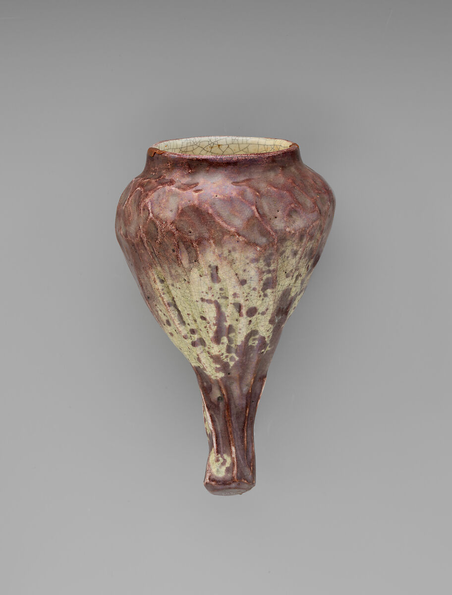 Nature is represented again in the hanging wall vase created for a flower arrangement. Covered in off-white lead and copper-based glazes, the body has a fine craquelure. The form of the vase, resembling a dried-out, wrapped leaf or fruit, or perhaps a nest, is somewhat irregular, and the rough texture of the clay was created by hand-shaping. Certain Tiffany designs manifest similarly dynamic shapes, and Moore favored such variegated coloration.