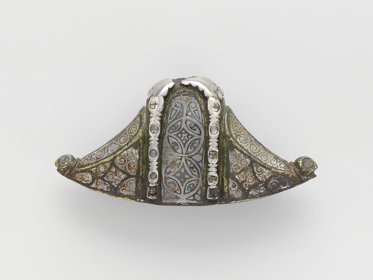 This handsome sword pommel is one of the finest surviving fragments of Anglo-Saxon goldsmith work. The pommel's quasi-triangular shell, of cast copper alloy, is decorated with silver panels inlaid with niello patterns and framed with silver strips. The two end terminals are animal heads. Although the "cocked-hat" form and the design of the panels look back to late eighth-century sword pommels (examples of which from Windsor, Chiswick, Eyot, and Saint Ninian's Isle are preserved in London, Edinburgh and Oxford), the silver-wire and niello technique used to create the inlaid running spiral patterns on the curved sides seems to have been a specialty of East Anglian metalworkers in the ninth century, during the reign of King Alfred the Great (r. 849–99). Some of the niello designs are similar to those on the well-known Fuller brooch in the British Museum, London, which was made in the late ninth century, perhaps in Alfred's court workshop.