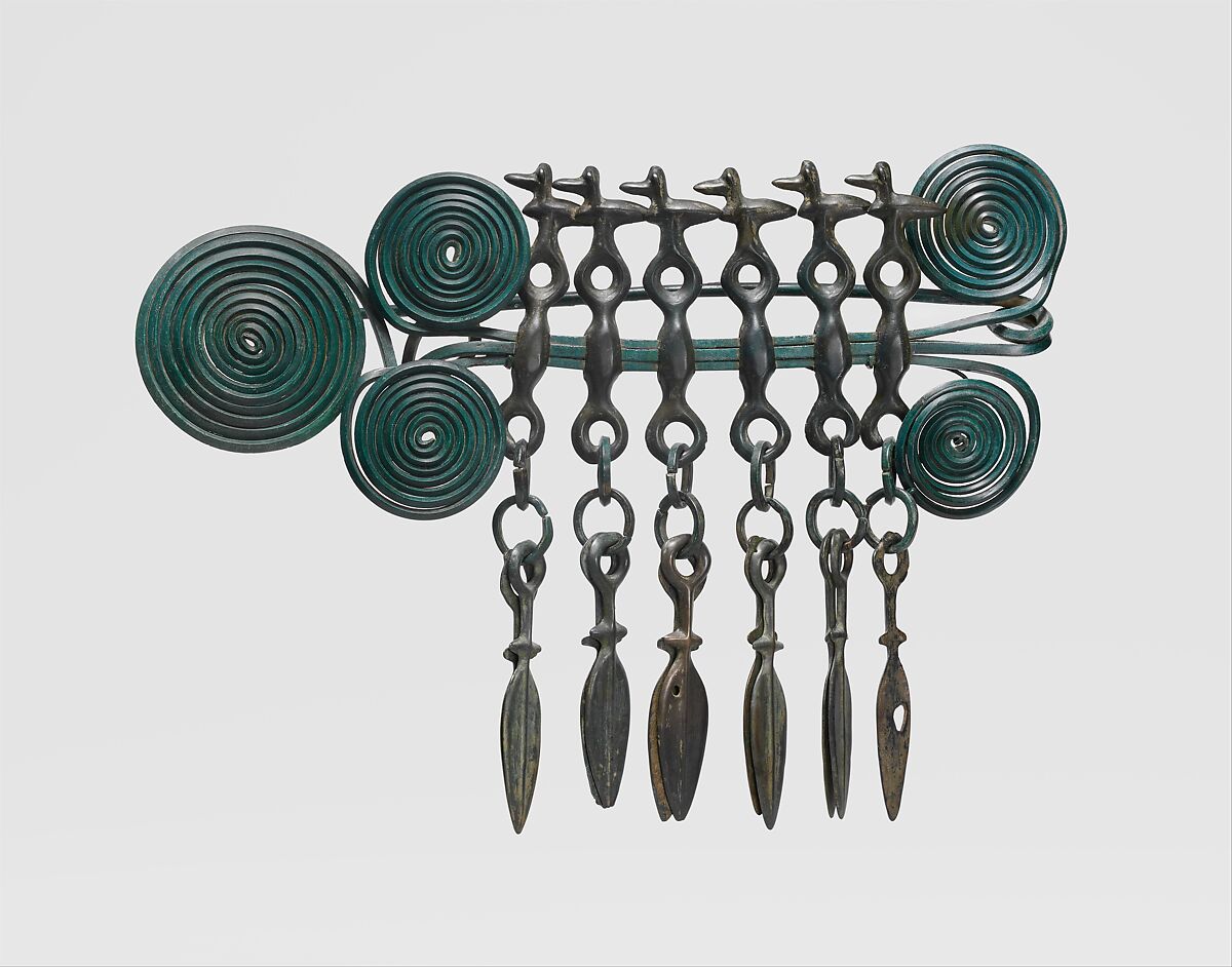 This brooch is one of the largest, most complex objects of its type to survive from late Bronze Age Europe. The five dynamic spirals were composed of three long wires. Hanging from the horizontal section are six composite elements: at the top of each is a bird surmounting a horse bit, beneath which are rings and pairs of dagger blades. The numerous hoards containing such objects suggest that they functioned as ritual offerings deposited during burials.