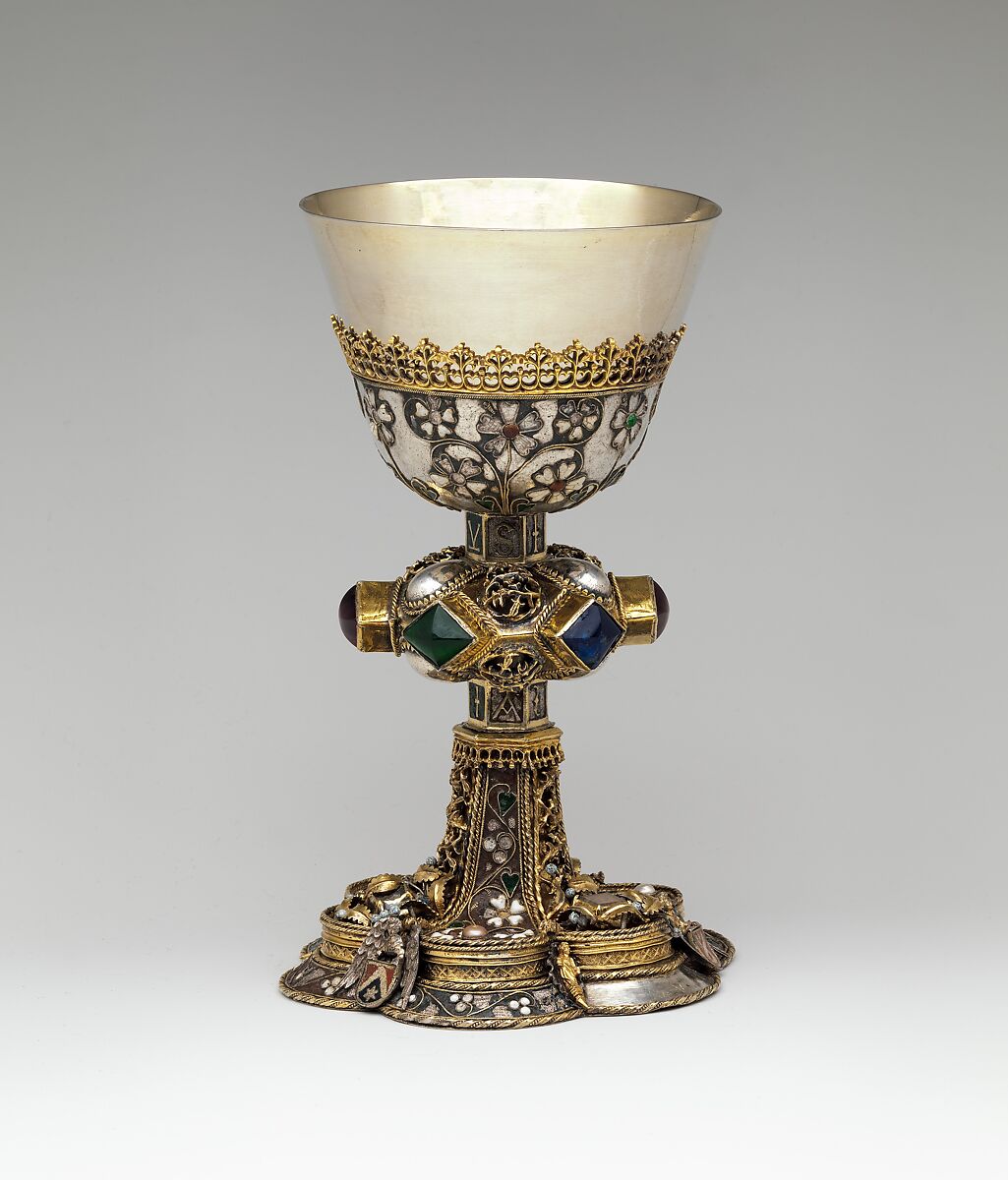 This is one of two Gothic chalices formerly in the collections of Baron Nathaniel de Rothschild in Vienna and Thomas F. Flannery in Chicago. Salgo prized these works because most similar vessels are still part of ecclesiastical treasuries. Repairs to and replacements on this object were inevitable due to its age and the delicacy of the enamel and other fragile materials. A fall may have damaged the upper part, including the gilded pierced border above the basket as well as the cup, which no longer fits tidily. A Hungarian mark dating from 1800 to 1828 could have been made by a proud goldsmith who restored the chalice.