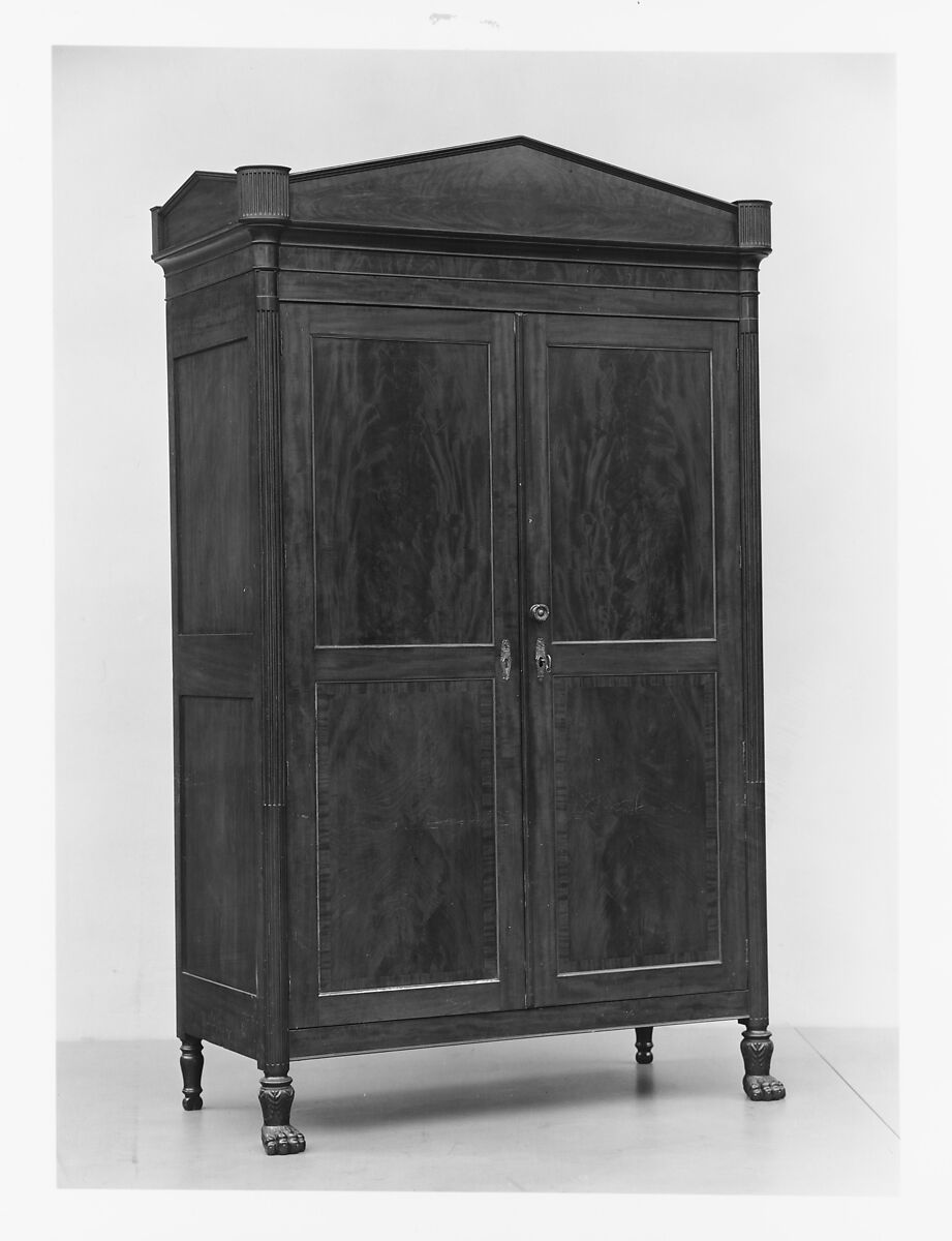 Although similar to an English wardrobe, this specific form is called a “French press” in the New York City book of prices for cabinetwork of 1810, a publication that set the wages for journeyman furniture makers. Behind the beautifully veneered doors are two sets of three sliding trays separated by two tiers of drawers. In contrast, a wardrobe was divided into an upper section with cupboard doors and a lower section with three drawers.
