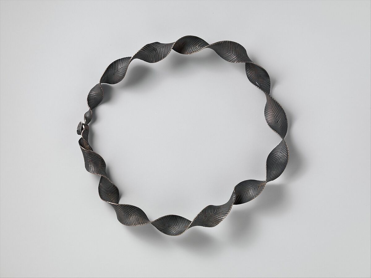 Silver was a rare commodity in Iron Age Ireland, yet this delicate torc, or neckband, was discovered with a cache of five others like it, also made of silver. Featherlight, the torc is made from a flat strip of silver, worked into a series of gentle twists. A subtle herringbone pattern decorates both sides.