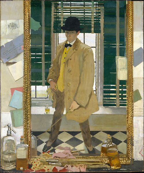 This self-portrait, also known as Leading the Life in the West, refers to Orpen's life as a young artist in the West End of London. Orpen stands reflected full-length in a mirror in his studio, wearing a bowler hat and holding gloves and a riding crop. A shelf below the mirror holds paintbrushes and rags, the tools of the artist's trade, as well as several bottles of liquor. Various pieces of correspondence, including an I.O.U. signed by Orpen, are tucked behind the frame of the mirror, further testifying to the pleasures and distractions of the painter's early career. The space of the picture is shallow but complex, with Orpen using his skills as a draftsman to resolve the challenges of surface, lighting, and reflection that he has set for himself.