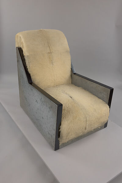 Although most Art Deco patrons were French, one of the era’s most complete, important residential design projects was realized in America: a penthouse apartment in San Francisco designed for Templeton Crocker (1884–1948), the millionaire grandson of the founder of the Union Pacific Railroad Company. Completed in 1928, the apartment contained a master bedroom, dining room, and breakfast room by Dunand; the noted French designers Jean-Michel Frank, Pierre Legrain, and Madame Lipska created the other rooms. The apartment was dismantled and sold in 1959. The "sponged" surface of the chair is characteristic of lacque arraché, a technique Dunard favored, wherein a final coat of lacquer is applied over a roughened layer—in this case, metallic gray over black. By polishing the entire surface, the raised peaks of the black lacquer were revealed, creating a mottled yet smooth effect.