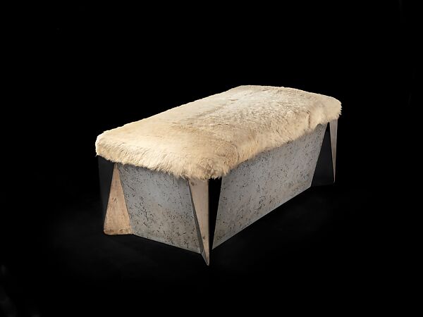 Although most Art Deco patrons were French, one of the era’s most complete, important residential design projects was realized in America: a penthouse apartment in San Francisco designed for Templeton Crocker (1884–1948), the millionaire grandson of the founder of the Union Pacific Railroad Company. Completed in 1928, the apartment contained a master bedroom, dining room, and breakfast room by Dunand; the noted French designers Jean-Michel Frank, Pierre Legrain, and Madame Lipska created the other rooms. The apartment was dismantled and sold in 1959. The "sponged" surface of the bench is characteristic of lacque arraché, a technique Dunard favored, wherein a final coat of lacquer is applied over a roughened layer—in this case, metallic gray over black. By polishing the entire surface, the raised peaks of the black lacquer were revealed, creating a mottled yet smooth effect.
