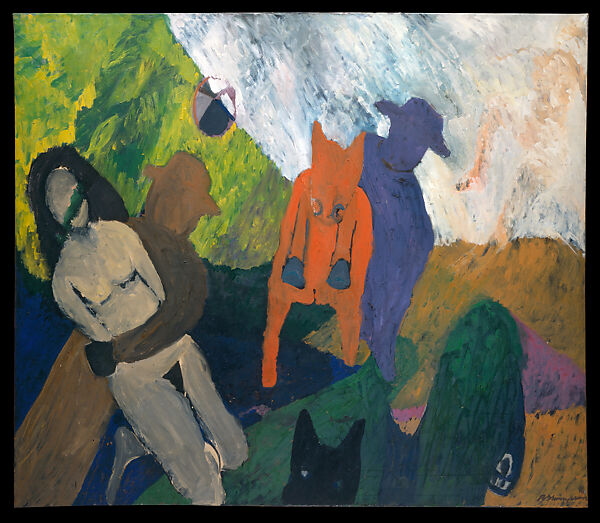 Fraught with ambiguities and contradictions, Allegory is an early painting from a pivotal moment in the short career of Bob Thompson, a prolific painter who participated in a variety of overlapping creative communities, from the figurative expressionists he met in Provincetown, Massachusetts in the summer of 1958 to the jazz musicians, Beat poets, and early performance artists with whom he socialized in Greenwich Village. Thompson’s paintings include recognizable, albeit schematic subjects that leverage the poetic, visual, and associative possibilities of form and color, translating the abstract rhythms of music into a visual language. Allegory dates to the period just after Thompson relocated from Louisville, Kentucky to New York, in either fall 1958 or spring 1959. During that time, the artist could be found at his studio just as often as he could at the Cedar Bar, the Five Spot Café, and the Happenings of artists such as Allan Kaprow and Red Grooms.[1] The Met counted among Thompson’s other haunts.[2] Indeed, by 1960 he had established an abiding interest in Renaissance and Baroque artists, whose themes he appropriated and transformed with great relish throughout his career, self-consciously situating himself within the very canon from which he, as a Black artist, had been excluded.[3] (Thompson referred to his adaptations of European art as "variations" in a rare 1965 interview.[4]) Since he would not travel to Europe until March 1961, Thompson availed himself instead of The Met’s substantial collection of Old Master prints, drawings, and paintings in 1959 and 1960.