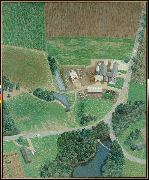In this canvas Jacquette, known for her dizzying aerial depictions of cities and landscapes, depicted a farm in Belfast, Maine (near her summer home), as seen from the window of a single-engine plane. Flying over the site on several excursions, she made preliminary sketches in charcoal and pastel that blocked out the shapes, patterns, and color masses seen below. Then, relying partially on memory and invention, she painted a large "jetscape" on canvas that eliminated the use of traditional vanishing-point perspective and engaged the viewer the way a map might.