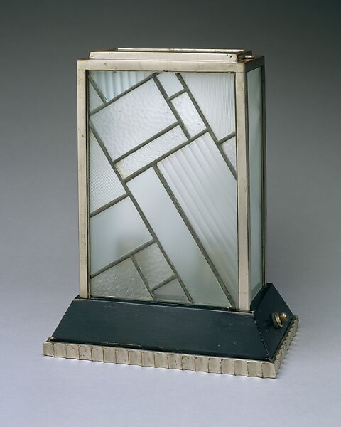 Creator of the interiors of Radio City Music Hall, Deskey is a towering figure in modern design. His lamp is a response to the upward thrust of the New York skyline. Its boxy proportions echo a tall, narrow building, while, on the two side panels, rectilinear puzzlelike patterns similarly evoke compressed architectural forms. The use of frosted glass in different textures activates the lamp’s surface, even as it diffuses the emitted light. The lamp’s compactness attests to Deskey’s awareness that he was typically designing for small domestic interiors.