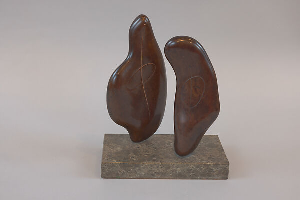 The smooth, irregular shapes of Two Forms relate closely to pebbles that Moore collected along the beaches of Norfolk, England. However, as the forms seem to intermingle and respond to each other, Moore’s sensuous sculpture also appears to be a pair of human bodies. This inherent and psychologically provocative ambiguity reveals the sculptor’s ties to Surrealism. The lines incised in the sculpture both relate to the Surrealist interest in spontaneous mark-making and suggest prehistoric hieroglyphics in stone.