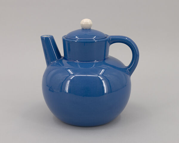 Karasz designed this teapot for Buffalo Pottery as part of a tea set. The simple pattern of the tea set, in Delphinium Blue and white, reflects both her Central European training and her experience in Java, where she spent time ca. 1930. The set was marked "Buffalo China," a "Lamelle Patented Design," in reference to a lamination process developed by Buffalo Pottery, in which a clay center was inlaid into vitreous china to produce wares that were stronger and more resistant to breakage than china alone.