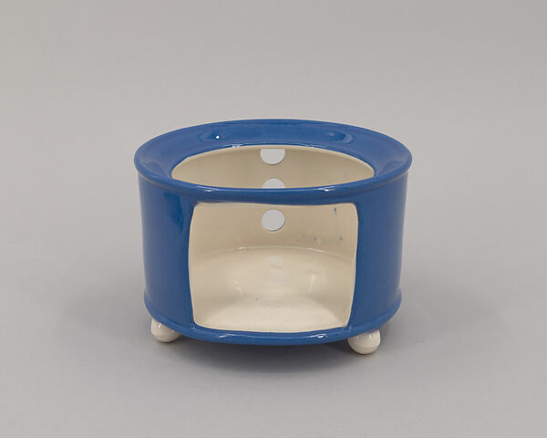 Karasz designed this teapot stand for Buffalo Pottery as part of a tea set. The simple pattern of the tea set, in Delphinium Blue and white, reflects both her Central European training and her experience in Java, where she spent time ca. 1930. The set was marked "Buffalo China," a "Lamelle Patented Design," in reference to a lamination process developed by Buffalo Pottery, in which a clay center was inlaid into vitreous china to produce wares that were stronger and more resistant to breakage than china alone.