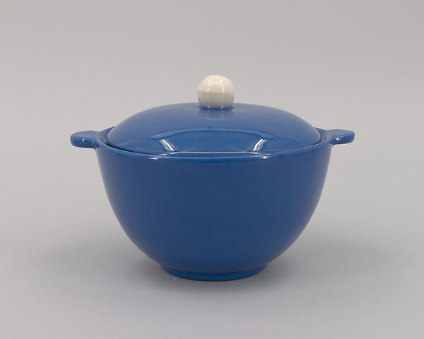 Karasz designed sugar bowl and lid for Buffalo Pottery as part of a tea set. This simple pattern of the tea set, in Delphinium Blue and white, reflects both her Central European training and her experience in Java, where she spent time ca. 1930. The set was marked "Buffalo China," a "Lamelle Patented Design," in reference to a lamination process developed by Buffalo Pottery, in which a clay center was inlaid into vitreous china to produce wares that were stronger and more resistant to breakage than china alone.