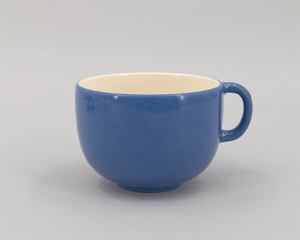 Karasz designed this cup for Buffalo Pottery as part of a tea set. The simple pattern of the tea set, in Delphinium Blue and white, reflects both her Central European training and her experience in Java, where she spent time ca. 1930. The set was marked "Buffalo China," a "Lamelle Patented Design," in reference to a lamination process developed by Buffalo Pottery, in which a clay center was inlaid into vitreous china to produce wares that were stronger and more resistant to breakage than china alone.