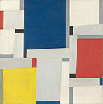Relational Painting Number 64 underscores Piet Mondrian’s impact on midcentury abstraction. Glarner adopted Mondrian’s simplified vocabulary of forms and colors, but he modified the Dutch artist’s severe geometry by introducing diagonal lines that changed rectangles into trapezoids and created irregular rhythmical patterns. Glarner also employed shades of gray for the lines in contrast to Mondrian’s use of black. These alterations added spatial dimensions to his compositions as well as a sense of movement and vitality that evokes urban architecture and dynamism.