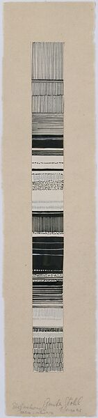Producing goods of artistic quality and fine materials in mass quantity has been the goal of modern design since the Arts and Crafts movement at the turn of the twentieth century. This drawing by a member of the Bauhaus Weaving Workshop is an example of design stripped down to elemental basics in order to achieve this goal. Stölzl was perhaps the most important member of the workshop. Her elegant design takes full advantage of the linear nature of the loom’s warp and weft to build a linear pattern, layer by layer.