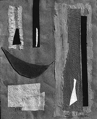 - Medium: Cut and torn pasted colored papers, fabrics and leather on brown paper, mounted on black paper