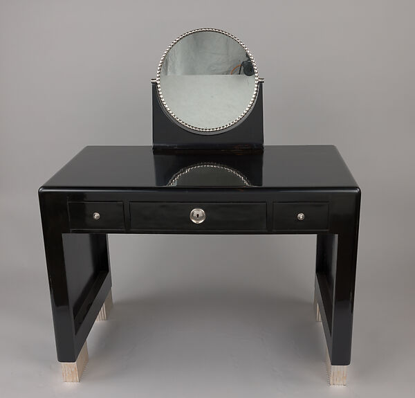 This luxurious dressing table reflects the increasing interest in colonial resources (both material and artistic) that characterized French design during the late 1920s and early 1930s. Its apparent finish is lacquer—a traditional Asian technique—and its form evokes the dignified simplicity of Asian furniture. Ruhlmann made this model in a variety of finishes, including white-leaded oak, eggshell lacquer, red natural lacquer, and black synthetic lacquer, as in this example. Synthetic lacquers, such as Duco (introduced by DuPont in 1924), were introduced in the early 1920s.