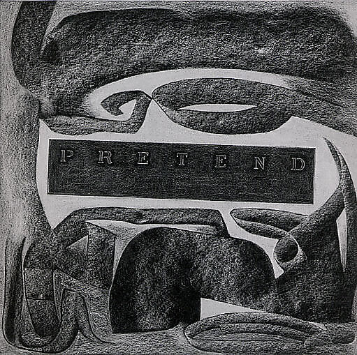In 1975, Samaras began a drawing series titled Matrix (the Latin root of which means mother and womb) upon hearing news over the phone of his mother’s death in Greece. The Matrix drawings were executed on black paper in glossy graphite and, occasionally, metallic pencil. They depict the artist’s hands (one holds a telephone cord), honeycomb patterns, and drafting utensils—French curves and protractors—combined with stenciled words and phrases such as "Do Not Forget," "Speechless," and, here, "Pretend."