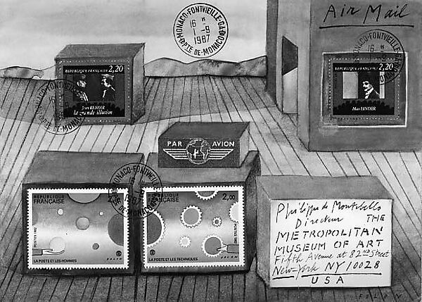- Medium: Watercolor, colored pencil, marker, postage stamps, and ink stamps with graphite on paper envelope
