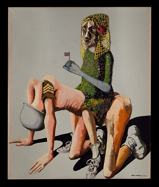 This startling and satirical scene of a patriotic woman astride a nude soldier forms part of Andrews’ ambitious Bicentennial Series, begun in 1970 in response to the 200th anniversary of the Declaration of Independence. The painting cycle combines a potent confrontation of racial inequities with a critique of unguarded patriotism. Andrews created this particular work in response to the Vietnam War, saying that it represented a powerful image of "the military being used by misguided citizenry." It depicts a woman clutching a miniature American flag as she straddles a gaunt figure clad only in boots, a helmet, and the insignia of a US Army sergeant. Here, the military—represented by the helmeted form—submits to the will of "the people"—the patriotic woman. Crushed under the weight of jingoistic fervor, the person on its hands and knees turns this anti-war allegory into a scene of sexual domination and submission.