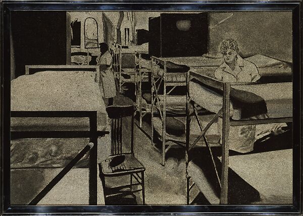 Artschwager began his career as a furniture-maker in the 1950s and is known for his conceptual sculptures, covered with wood-grained formica and bright acrylic paint, that at first seem to mimic dressers, chairs, or cabinets. By the 1960s he had also begun to make paintings like this one in a gray, monotone acrylic that have black-and-white found photographs as their sources. The support for these paintings is Celotex, an insulating product used in construction, which provides the strange allover texture—like an artificially-produced brushwork.