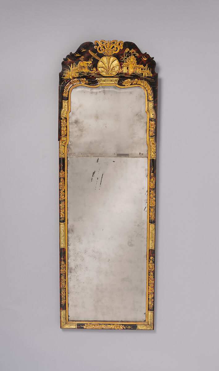 Japanning, the use of paint and gilded gesso to imitate the glossy finish on Asian lacquerwork, was a popular method of furniture decoration in colonial Boston. This looking glass, part of a group (40.37.1, .2, .4) of japanned furniture that descended in the Pickman family of Salem, Massachusetts, is an extraordinary survival. The painted decoration on the high chest, dressing table, and looking glass is all by the same hand.