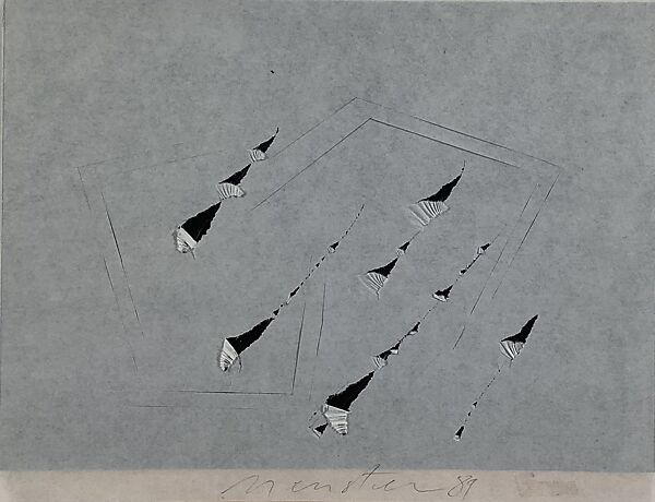 Joshua Neustein’s Carbon Series drawings originate in childhood memories of the darkness, shadows, and brief flickers of light glimpsed while living in basements during World War II. Rather than representing such memories, however, Neustein has evoked the workings of memory itself. He took carbon sets—pieces of letterhead interspersed with carbon paper for the purpose of making copies—and folded, incised, and tore them. As a result, he explained, "the image is ‘unhinged’ from the material surface and circulates in unframed space, between parts of one pictorial plane or transferred between several pictorial planes." Neustein’s use of a common office product intended for the replication of documents draws upon the Duchampian tradition of the readymade but is lent added poignancy by the carbon set’s obsolescence in a world of photocopy machines and computers.