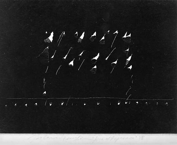 Joshua Neustein’s Carbon Series drawings originate in childhood memories of the darkness, shadows, and brief flickers of light glimpsed while living in basements during World War II. Rather than representing such memories, however, Neustein has evoked the workings of memory itself. He took carbon sets—pieces of letterhead interspersed with carbon paper for the purpose of making copies—and folded, incised, and tore them. As a result, he explained, "the image is ‘unhinged’ from the material surface and circulates in unframed space, between parts of one pictorial plane or transferred between several pictorial planes." Neustein’s use of a common office product intended for the replication of documents draws upon the Duchampian tradition of the readymade but is lent added poignancy by the carbon set’s obsolescence in a world of photocopy machines and computers.