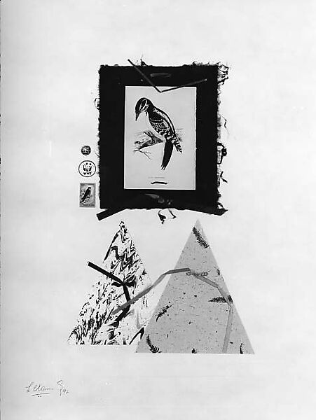 - Medium: Pasted handmade papers, postage stamp, ribbons, found torn intaglio printed paper, black ink stamp, and blind embossed stamps on paper