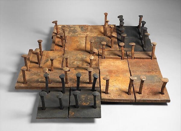 Over the course of four days In March 1993, Adkins fabricated eight sculptures, including this one, using materials sourced in Greensboro, North Carolina. High Point is a floor-based work composed of jettisoned equipment from the Norfolk Southern Railroad, namely rusted steel tie plates punctured with railroad spikes. Its material composition and curious form evokes the coal train that winds its way through Greensboro and the nearby town of High Point, while its title is a coded nod to jazz saxophonist John Coltrane, who grew up in the neighborhood. Though powerfully physical in its sculptural construction, High Point recalls the ephemerality of improvisatory music through its reference to the vanished history of Greensboro.
