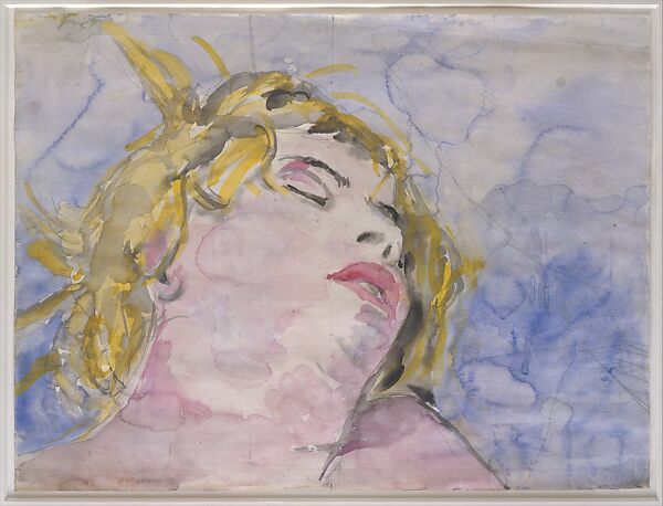 This two-part work pays homage to the English writer Virginia Woolf (1882–1941), whose novels Kiefer and his wife, Julia (who probably served as the model for the dreaming head above), admired. In the lower sheet, fire and water are combined, as they are at the end of Wagner's monumental Ring Cycle—here, in the form of a tiny ship aflame at sea. Rapture and watery death—references, perhaps, to Woolf's seaside novel To the Lighthouse (1927) or her suicide by drowning or perhaps the German army's failed attempt to cross the English Channel during "Operation Sea Lion" (1940)—are explored in this subtle, evocative pairing.
