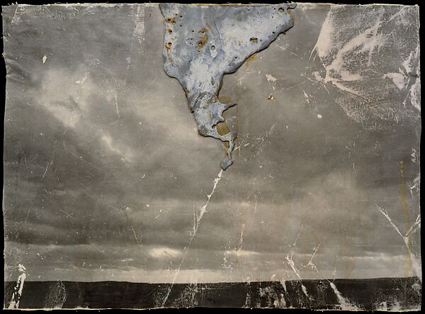 Kiefer discovered lead as an artistic medium while repairing an old washing machine. It appealed to the artist because of its different applications, whether by alchemists who try to turn it into gold or by medical professionals who use it to protect patients from the harmful effects of X-rays. In Strike, Kiefer combined lead with a photograph made from exposed film that he had deliberately left too long in the fixative bath during the development process, partially destroying its emulsion and producing streaks. He aligned the lead cloud form with one of those streaks, creating a kind of lightning bolt that links the sky and the nearly abstract landscape.