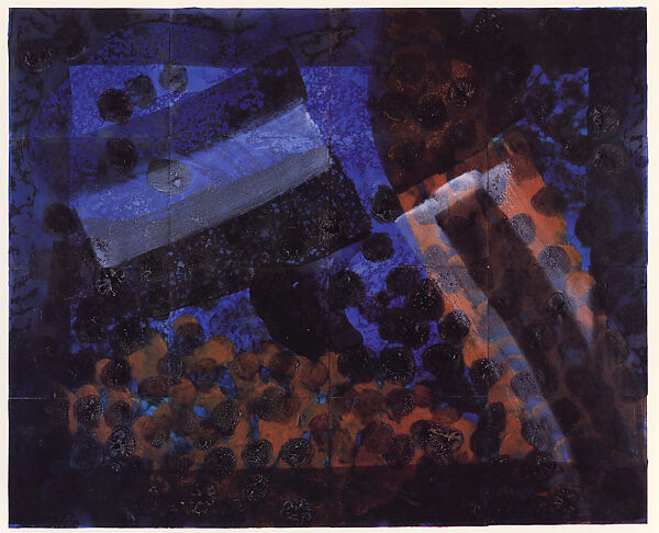 Venice, Evening is one of four prints comprising Hodgkin’s Venetian Views series, which grew out of the artist’s unrealized plan to illustrate Thomas Mann's novel Death in Venice (1912). Among the most complex prints the artist has produced, each print in the series is based on an imaginary view of the city at a different time of day, printed from the same five printing plates. While certain marks and formats are repeated throughout the series, Venice, Evening, executed on sixteen separate sheets, is richly colored and exudes its own distinct mood and emotional tenor. The Venice prints retain the exhilarating immediacy of the artist's paintings in the high drama of their surging, explosive forms.