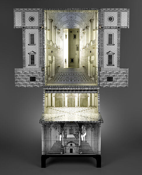 Although historical precedent provides the formal and decorative inspiration for this drop-front writing cabinet (sixteenth-century Italian Mannerist architectural compositions and furniture in particular), there is a surreal quality to Fornasetti's witty and inventive architectural fantasy, which plays games with perspective and preconceptions of interior and exterior space. The desk represents a collaboration between the architect Ponti, who designed the pared-down yet still traditional form, and the designer Fornasetti—a former student of Ponti—who was responsible for the exuberant, pseudo-illusionist decoration.