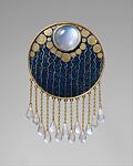 Hauser's principal motif for this brooch is the night-blooming lotus, a member of the water-lily family, which for centuries has been a symbol of evolution and enlightenment. The stylized flowers, growing on delicately tapering wavy stems, seem to float upward, as if attracted to the soft glow of the large cabochon moonstone. The flecked lapis-blue enameled background suggests the liquid reflection of a starry nighttime sky. Thirteen pendant moonstones hang from gold chains like murky water drops. The semiprecious materials and symbolist imagery would have appealed to a progressive European clientele, much like the jewels designed by his French counterpart René Lalique.