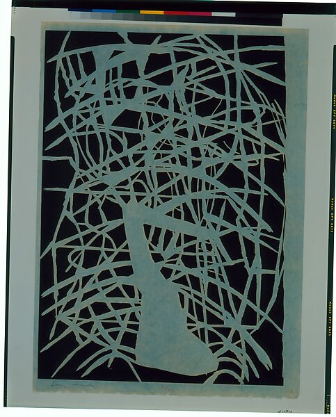 - Medium: Linocut on Japanese paper toned with blue dye, from a portfolio of six prints by the artist
